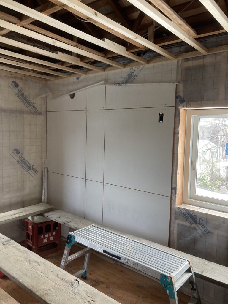 耐力壁面材の上に、調湿気密シートを貼っています。