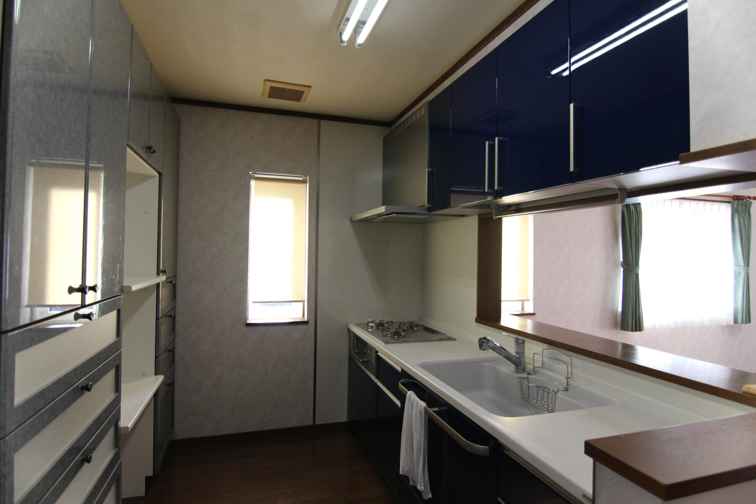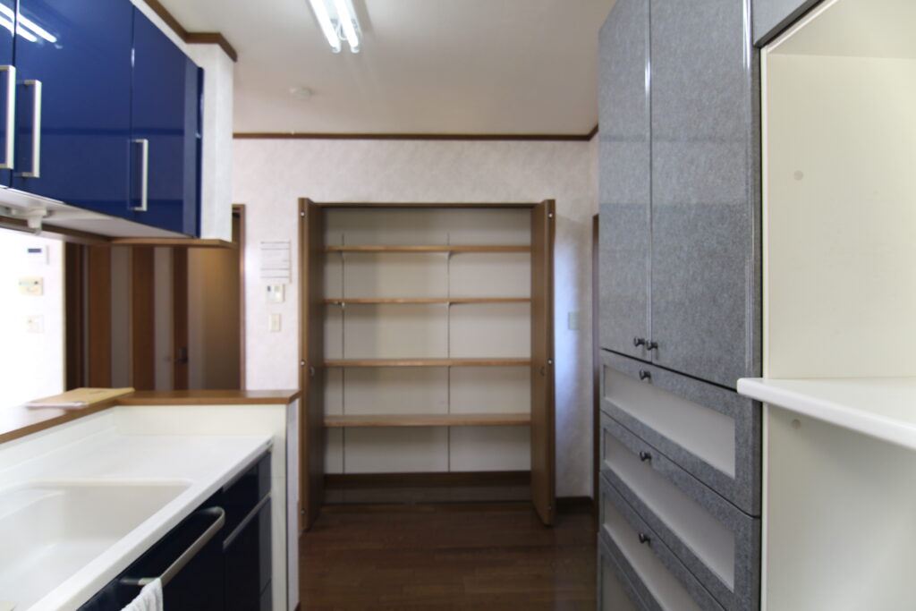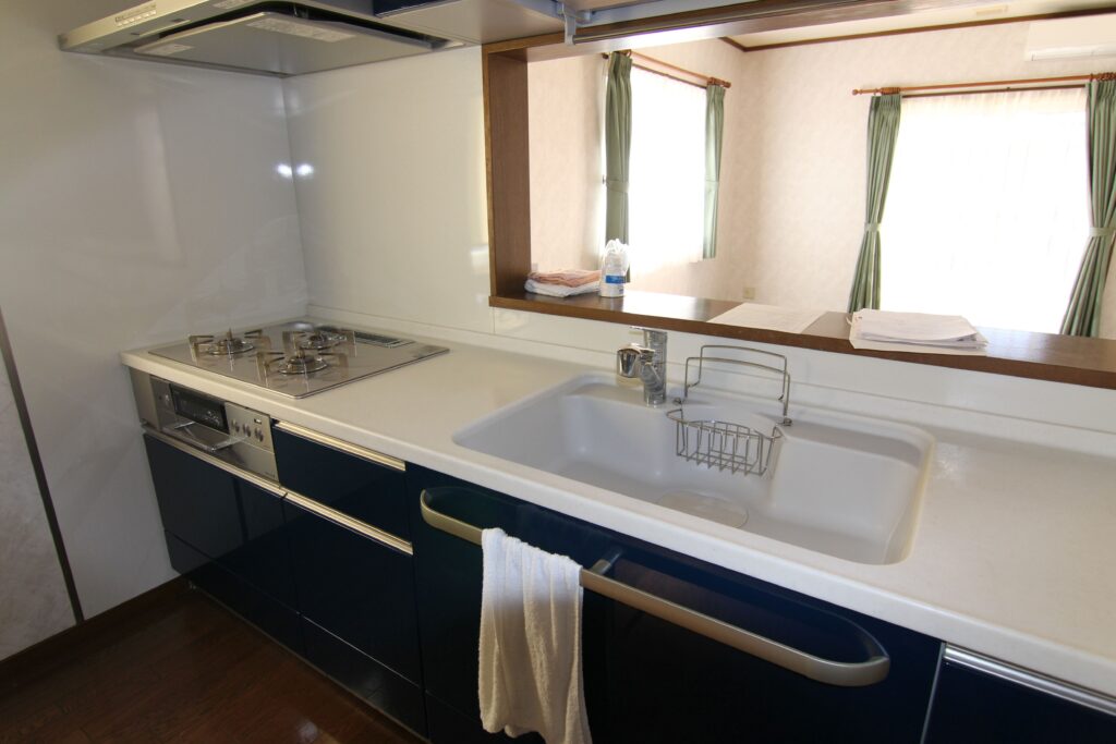 混合水栓、3口コンロ、レンジフードが設備としてあります。また、このキッチンはとにかく収納が多いことが特徴的です。