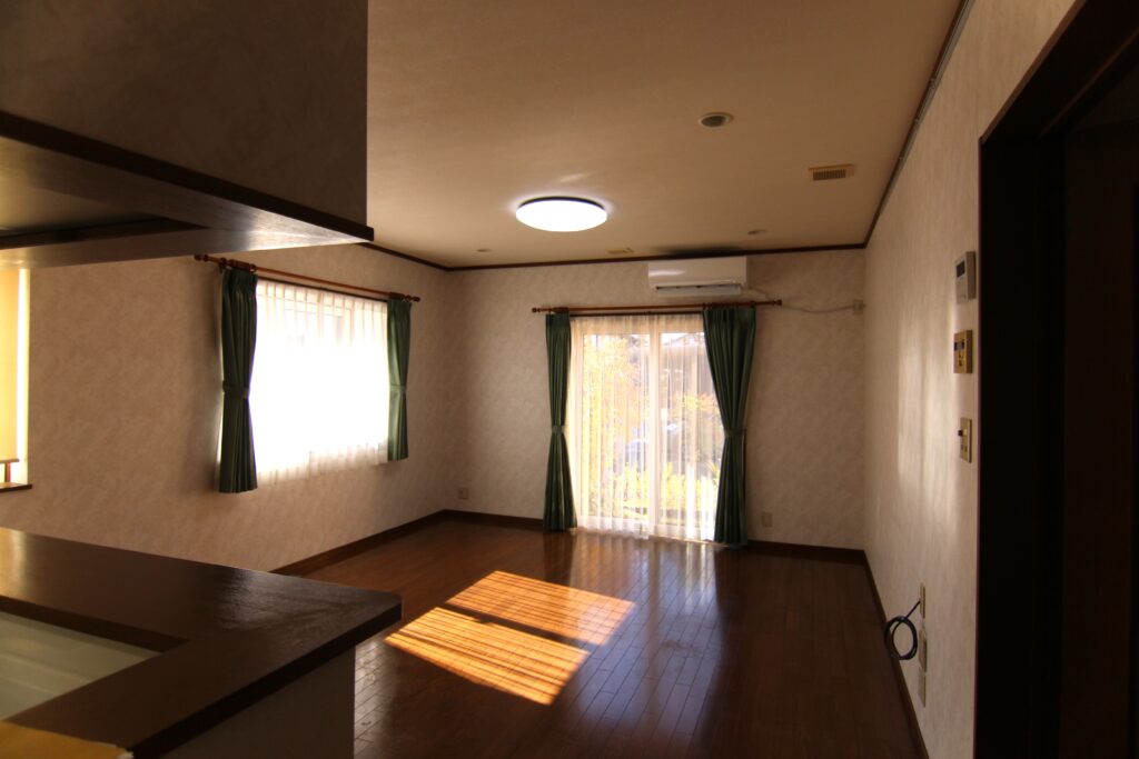 真中の画像は、その掃き出し窓付近からカウンター方向へのものです。奥には勝手口の扉も見えます。