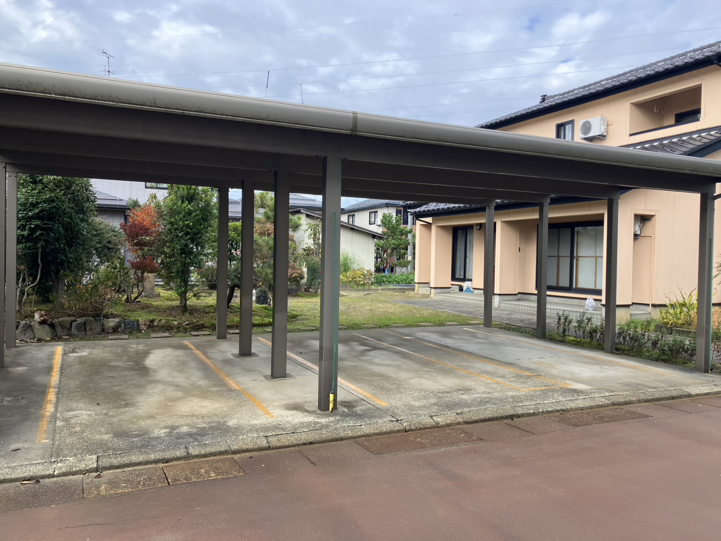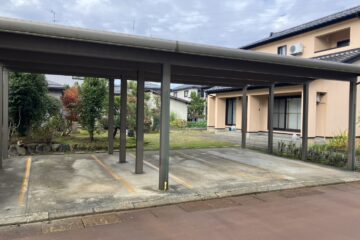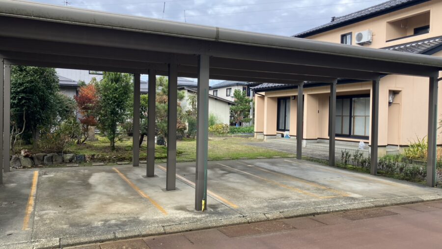 また、右の画像ですが、屋根付きカーポートで普通車3台が駐車可能です。2台はよくありますが、